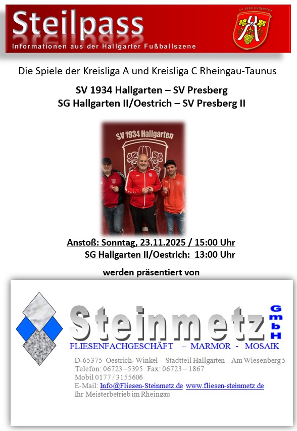 Der „Steilpass“ ist die offizielle Stadionzeitschrift zu den Heimspielen des SV 1934 Hallgarten und enthält alles Wissenswerte aus dem Senioren- und Jugendbereich zum aktuellen Spieltag.
